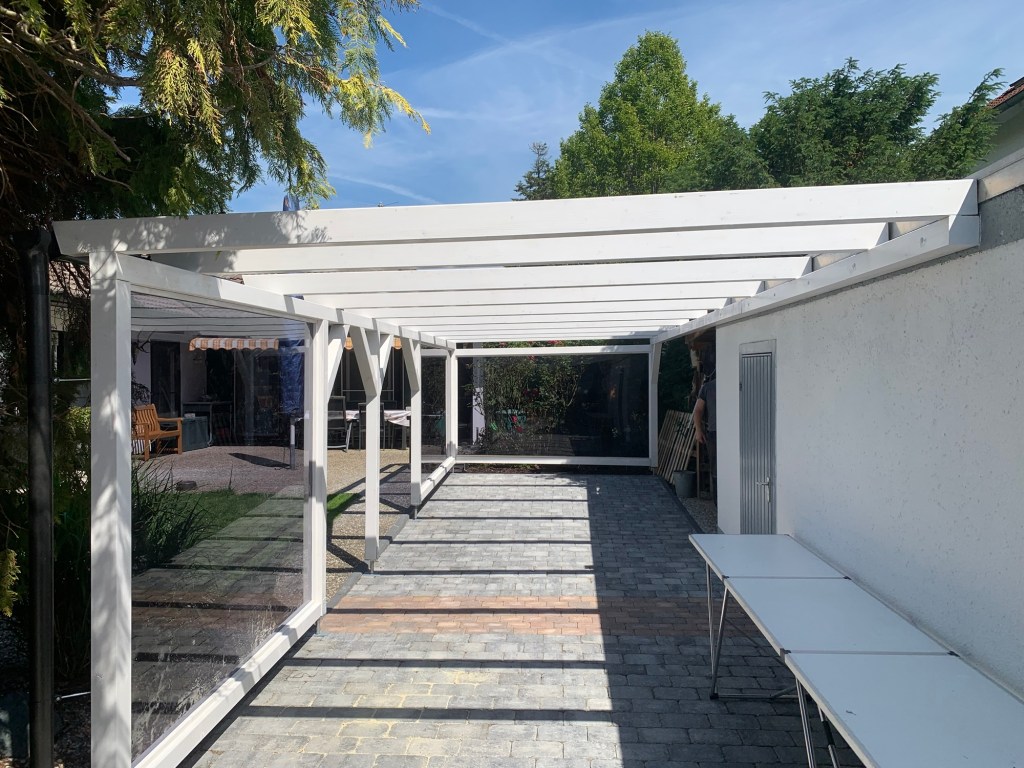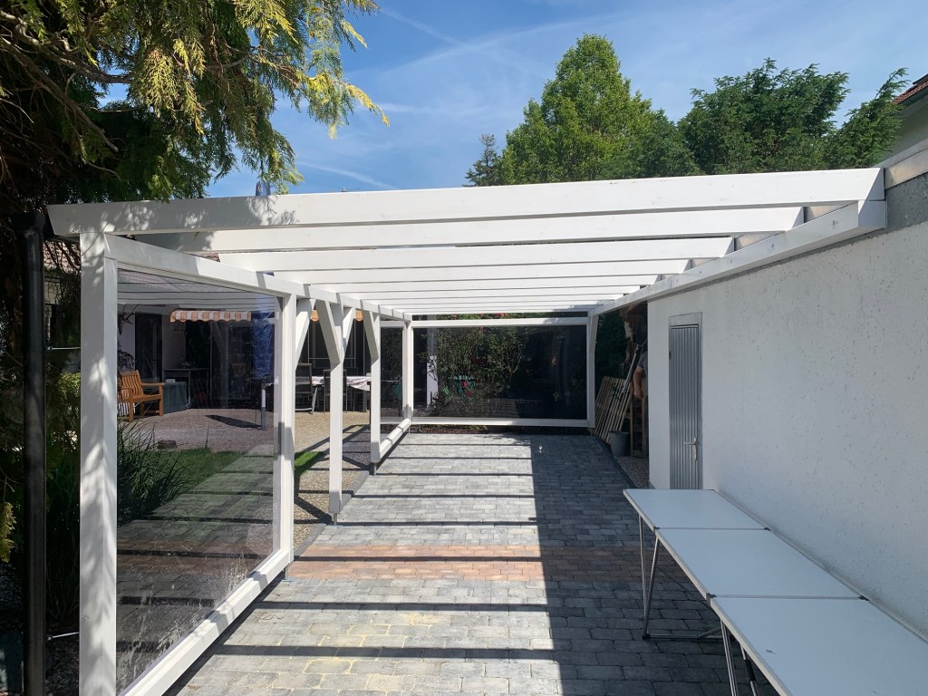 Ein integrierter Windfang ergänzt die Pergola sinnvoll. Er reduziert seitlichen Wind und Regen und schützt Fahrzeuge, Hofeinfahrt sowie angrenzende Eingangsbereiche. Gestaltung und Ausführung werden optisch auf die weiße Holzkonstruktion abgestimmt.