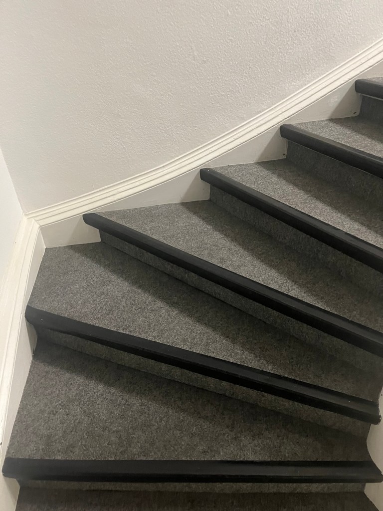 Diese Treppenrenovierung zeigt eindrucksvoll, wie sich eine alte, mit Teppich belegte Treppe in eine moderne Wohntreppe verwandeln lässt. Der ursprüngliche dunkle Teppichbelag war sichtbar abgenutzt, pflegeintensiv und passte optisch nicht mehr zum Wohnstil.