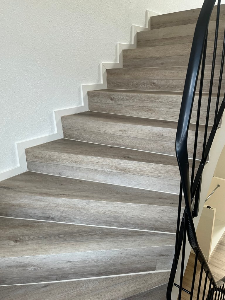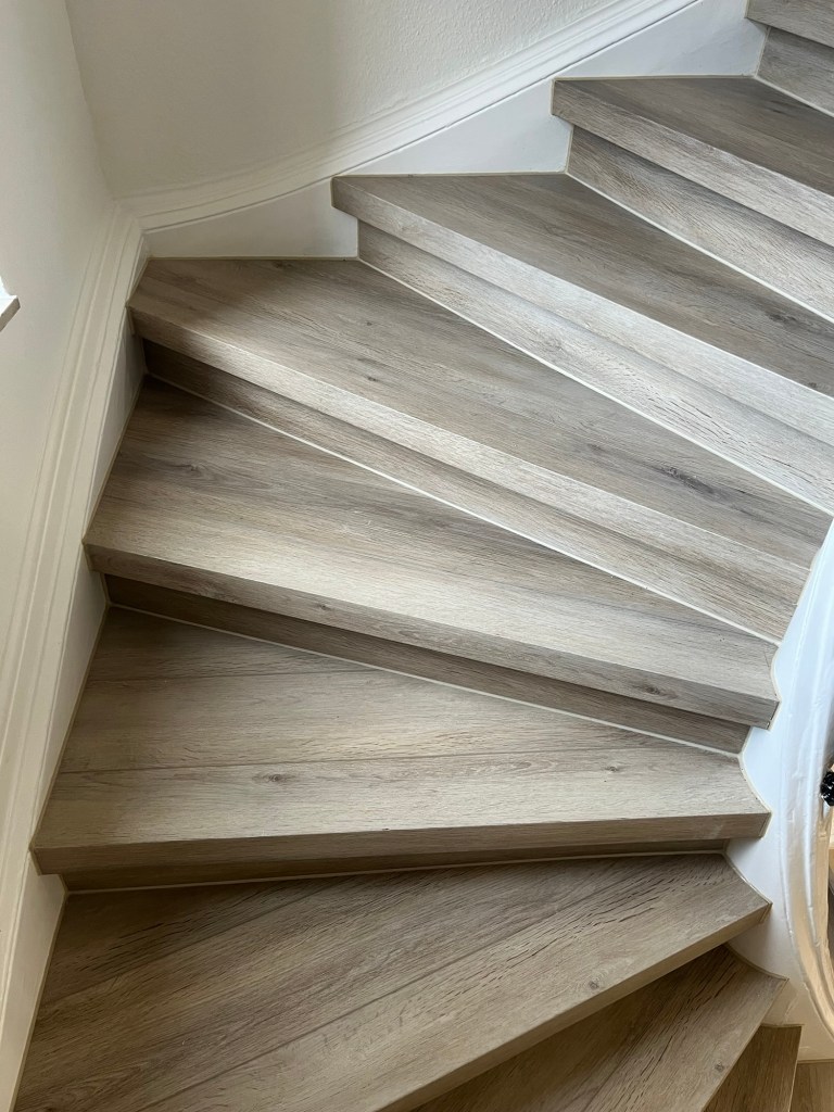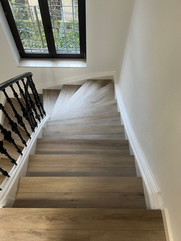 Nach der fachgerechten Entfernung des Teppichs wurde die Treppe professionell vorbereitet und mit einem hochwertigen Vinylbelag in heller Holzoptik renoviert. Besonders bei gewendelten Treppenstufen ist eine präzise Ausführung entscheidend – jede Stufe wurde passgenau zugeschnitten und sauber verlegt.